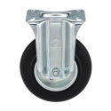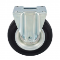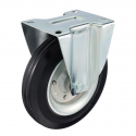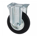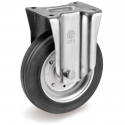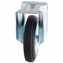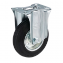 Колесо неповоротное промышленное из черной резины. Жесткость 80 шор А. Центр-сердечник состоит из двух гальванизированных дисков, соединённый прочными заклепками. Все элементы выполнены из высококачественной стали. Роликовый подшипник расположен в углублении, выдавленном под прессом, и содержит цилиндрические ролики подшипника в обойме из полиамида 6. В ступице используется игольчатый (роликовый) подшипник. Опора с фиксированным кронштейном серии NL. Эта серия широко используется, с любыми тележками и контейнерами, легкой и стандартной грузоподъемности, для строительных лесов, а также для работы вне помещений. Применение: тележки для внутренних и внешних работ на складах и в промышленности, багажные тележки, для строительных лесов, контейнеры для мусора, электрооборудование. Поверхности перемещения: для полов, практически любого типа, даже вне крытых помещений. Позволяют легко преодолеть препятствия, не наносят урон хрупким напольным покрытиям. Температурный диапазон эксплуатации от -20 до +60С. Характеристики:
