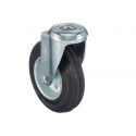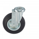 Колесо поворотное под болт промышленное из черной резины. Жесткость 80 шор А. Центр-сердечник состоит из двух гальванизированных дисков, соединённый прочными заклепками. Все элементы выполнены из высококачественной стали. Роликовый подшипник расположен в углублении, выдавленном под прессом, и содержит цилиндрические ролики подшипника в обойме из полиамида 6. Качественный поворотный кронштейн серии SL c двойным шарикоподшипником в основании и с отверстием для крепления через центральный болт. Эта серия широко используется, с любыми тележками и контейнерами, легкой и стандартной грузоподъемности, для строительных лесов, а также для работы вне помещений. Применение: тележки для внутренних и внешних работ на складах и в промышленности, багажные тележки, для строительных лесов, контейнеры для мусора, электрооборудование. Поверхности перемещения: для полов, практически любого типа, даже вне крытых помещений. Позволяют легко преодолеть препятствия, не наносят урон хрупким напольным покрытиям. Температурный диапазон эксплуатации от -20 до +60С. Характеристики: